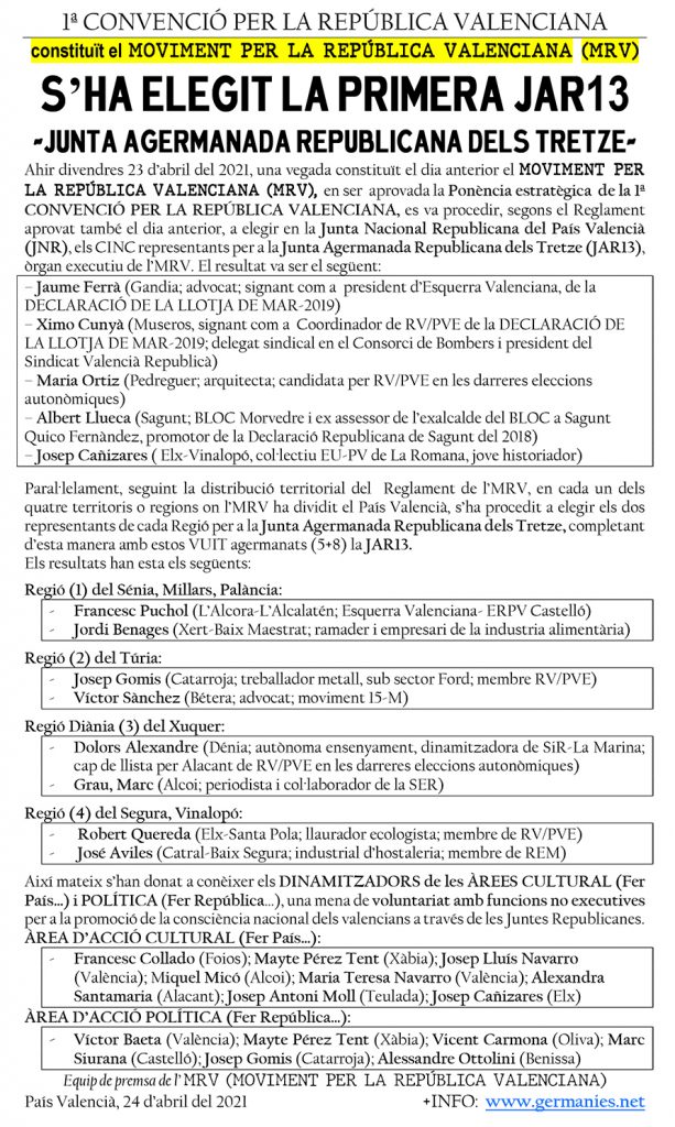 constituït el MOVIMENT PER LA REPÚBLICA VALENCIANA (MRV), S’HA ELEGIT LA PRIMERA JAR13 (JUNTA AGERMANADA REPUBLICANA DELS TRETZE) abril 24, 2021abril 24, 2021